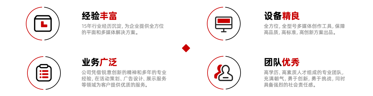 憑借銳意創(chuàng)新的精神和多年的專業(yè)經(jīng)驗,在活動策劃、廣告設(shè)計、展示服務(wù)等領(lǐng)域為客戶提供優(yōu)質(zhì)的服務(wù)。
